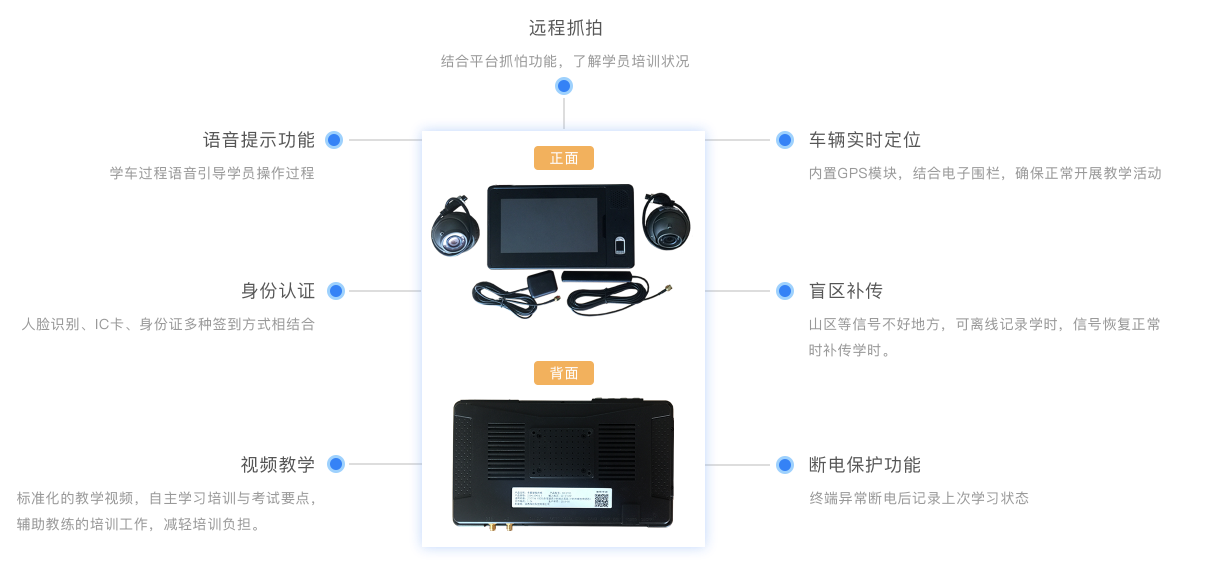 陜西導航科技有限公司生產的智能車載學時終端(簡稱計時儀)是一款集計時、GPS、北斗雙模,4G(全網通)、IC卡/身份證ID識別、拍照(錄像)、指紋識別等功能為一體的多功能車載學時設備終端,它使用GPS/北斗獲取培訓車輛實時軌跡信息并通過4G無線上傳軌跡、圖片(錄像)等信息,確保了培訓記錄真實有效。